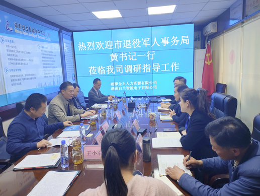 2021年11月19日下午,湘潭市退役軍人事務局黨組書記、局長黃建平一行蒞臨我司調(diào)研指導退役軍人就業(yè)創(chuàng)業(yè)服務工作開展情況,湘潭市退役軍人事務局黨組副書記、副局長唐建軍、岳塘區(qū)退役軍人事務局局長鄧雅譽、湘潭市退役軍人事務局就業(yè)創(chuàng)業(yè)科科長楊光、湘潭市退役軍人事務局辦公室主任科員謝添等相關(guān)領(lǐng)導一起參加調(diào)研。