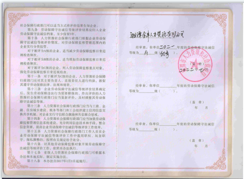 為進一步提高用人單位守法誠信意識,促進用人單位依法用工,構(gòu)建和諧穩(wěn)定勞動關(guān)系,切實維護勞動者合法權(quán)益,根據(jù)《勞動保障監(jiān)察條例》(國務院令第423號)、《企業(yè)勞動保障守法誠信等級評價辦法》(人社部規(guī)【2016】1號)和《湖南省用人單位勞動保障守法誠信等級評價試行辦法》(湘人社發(fā)【2016】92號)相關(guān)規(guī)定,湘潭市人力資源和社會保障局對市轄用人單位組織開展了2021年度勞動保障守法誠信等級評價工作。經(jīng)綜合評審,我司被評為2021年度勞動保障守法誠信A級優(yōu)秀單位。